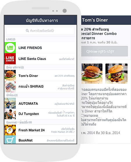 เพิ่มบัญชีผู้ใช้ที่เป็นทางการของศิลปินคนโปรด รวมทั้งบรรดาเซเล็บ แบรนด์สินค้าชื่อดัง และทีวีโชว์เป็นเพื่อน เพื่อรับข่าวสารใหม่ๆ และคูปองที่ได้เฉพาะใน LINE เท่านั้น