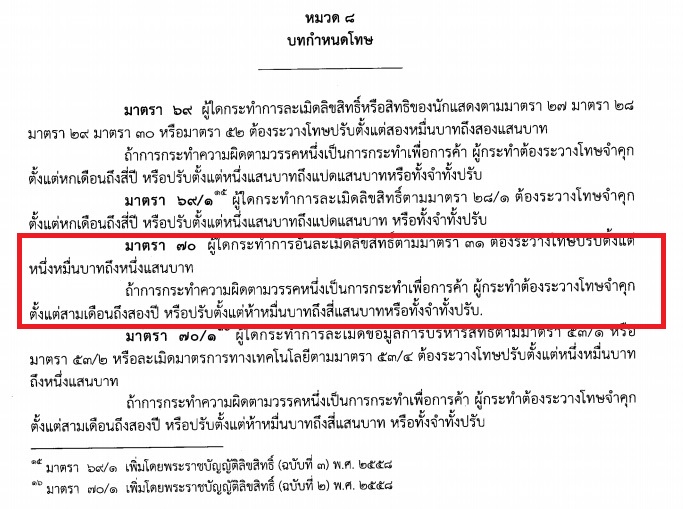- หากพฤติกรรมทำละเมิดดังกล่าวเพื่อการค้า ผู้กระทำจะมีโทษจำคุกตั้งแต่หกเดือนถึงสี่ปี หรือปรับตั้งแต่หนึ่งแสนบาทถึงแปดแสนบาทหรือทั้งจำทั้งปรับ (๒)