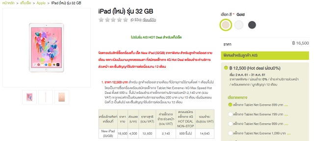 เรื่องมีอยู่ว่า หลังจากที่ผู้เขีย่นได้เขาไปเลือก iPad 2018 ที่ร้านหนึ่ง (ซึ่งตอนแรกกะว่าจะซื้อแบบ Wifi 32 GB ที่ Apple Store และ + APPLE Care อีก 2 ปี แต่ก็เปลี่ยนใจเพราะเห็นว่าในค่ายมือถือนี้ เสนอรุ่น Cellular 32 GB ในราคามากกว่ารุ่น Wifi เพียง 1,000 บาท เท่านั้น แม้ว่าจะเสียค่าบริการล่วงหน้า 2,000 บาท แต่ก็เท่ากับว่าเราเสียค่ารายเดือนต่อไปในเดือนละ 399 บาท เท่านั้น) และพอกลับมาเช็คใน AIS Shop Online ก็งงว่า มี iPad 2 แบบ ราคา 12,500 กับ 15,900 บาท ก็เลยงงว่า อ่าว! รุ่นที่เราได้มานี้มันเป็นรุ่นไหนกันแน่หว่า (เผื่อใครอยากสั่งซื้อ iPad , iPhone ผ่าน AIS Shop ก็คลิกผ่านลิ้งค์นี้ไปหน้าเว็บได้เลย)