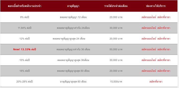 ดอกเบี้ยปัจจุบันเริ่มต้นที่ 9% ถ้าหากคุณมีภาระค่าใช้จ่ายต่อเดือนสูงแล้วอยากจะผ่าน ก็ต้องเลือกจำนวนเดือนผ่อนยาว ๆ สัก 24 เดือนขึ้นไป