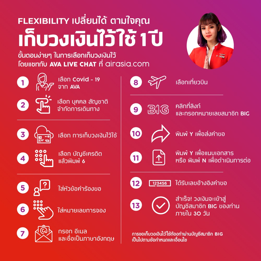ข้อดีของการเก็บวงเงินไว้ใช้ เหมาะสำหรับ ผู้ที่ยังเลือกวันที่จะเลื่อนเดินทางไม่ได้ หรือไม่รู้ว่าจะต้องเดินทางได้อีกเมื่อไหร่ หรือกังวลว่า COVID-19 จะเลิกระบาดหรือยัง โดยคาดว่าหากอนาคตยังระบาดอยู่ AirAsia ก็จะยังคงรักษาเครดิตไว้ให้เรานั่นเอง เพราะเรามั่นใจในบริการของ AirAsia รู้สึกดีมากที่เขาให้เลื่อนไฟลท์ได้ด้วยความสมัครใจได้แล้ว โดยคุณต้องเข้าไปทำตามขั้นตอนดังนี้