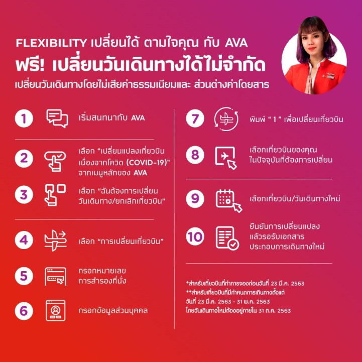 โดยหากใช้วิธีขอเลื่อนเที่ยวบินต้องเลื่อนเที่ยวบินให้อยู่ภายใน 31 ตุลาคม 2563 นี้เท่านั้น สอบถามข้อมูลเพิ่มเติมได้ที่น้องเอวานะครับ