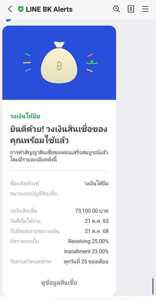 13. เมื่อสมัครผ่านก็จะมีวงเงินขึ้นให้ใน LINE BK Alerts และในฟีเจอร์ LINE BK แต่จะใช้เวลาพิจารณากี่วันนั้น ขึ้นอยู่กับความครบถ้วนของเอกสาร แต่ละคนก็จะได้วงเงินไม่เท่ากัน ภาพที่นำมาแสดงเป็นตัวอย่างที่มีผู้สมัครใช้บริการ ได้สมัครผ่านแล้ว