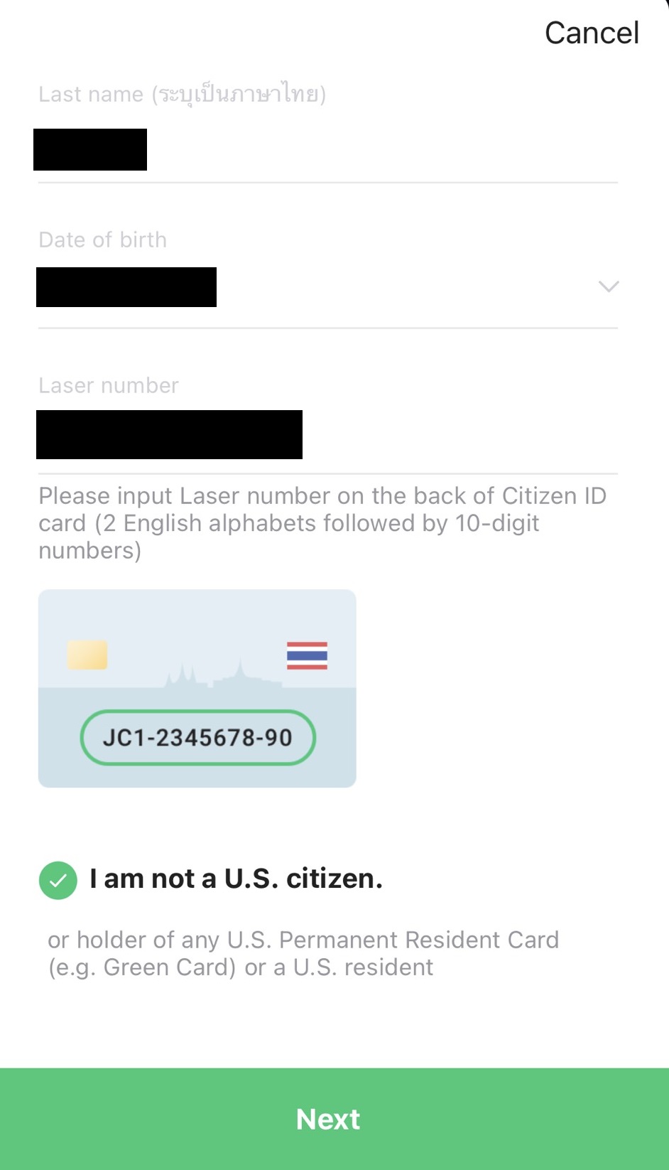 4. ลงทะเบียนด้วยการใส่ชื่อนามสกุลภาษาไทย รวมถึงเลขรหัสหลังบัตรประจำตัวประชาชน (Laser Number)