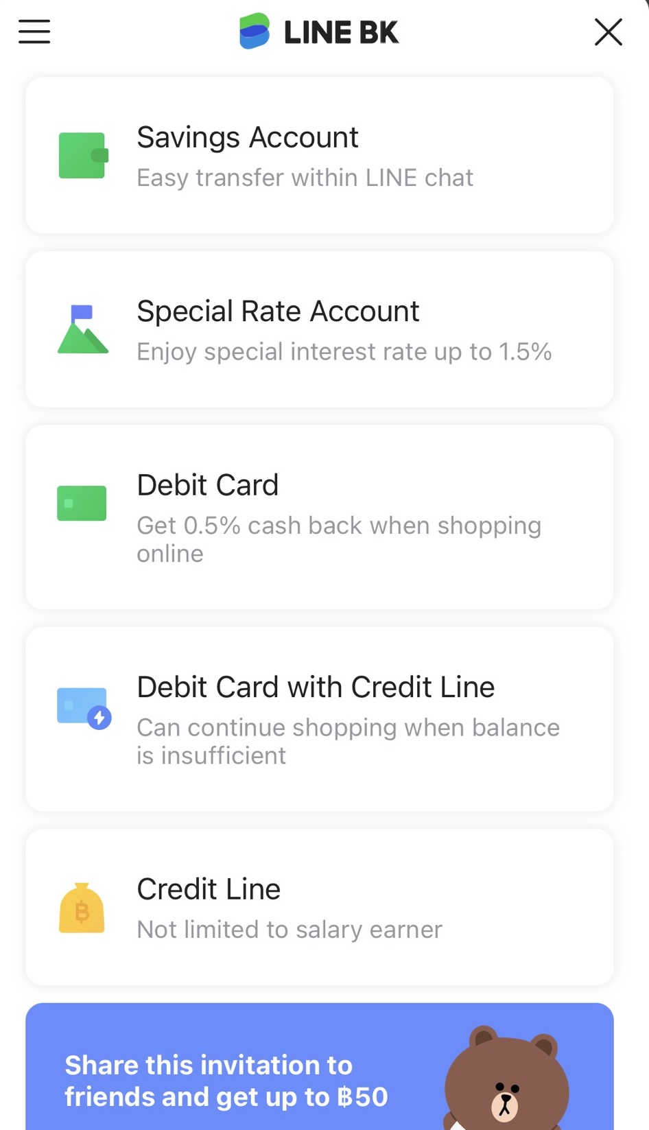3. เลือกเปิดบัญชี Savings Account กับ LINE BK ก่อนถึงจะเข้าสู่หน้ากู้ยืมเงินไลน์ได้