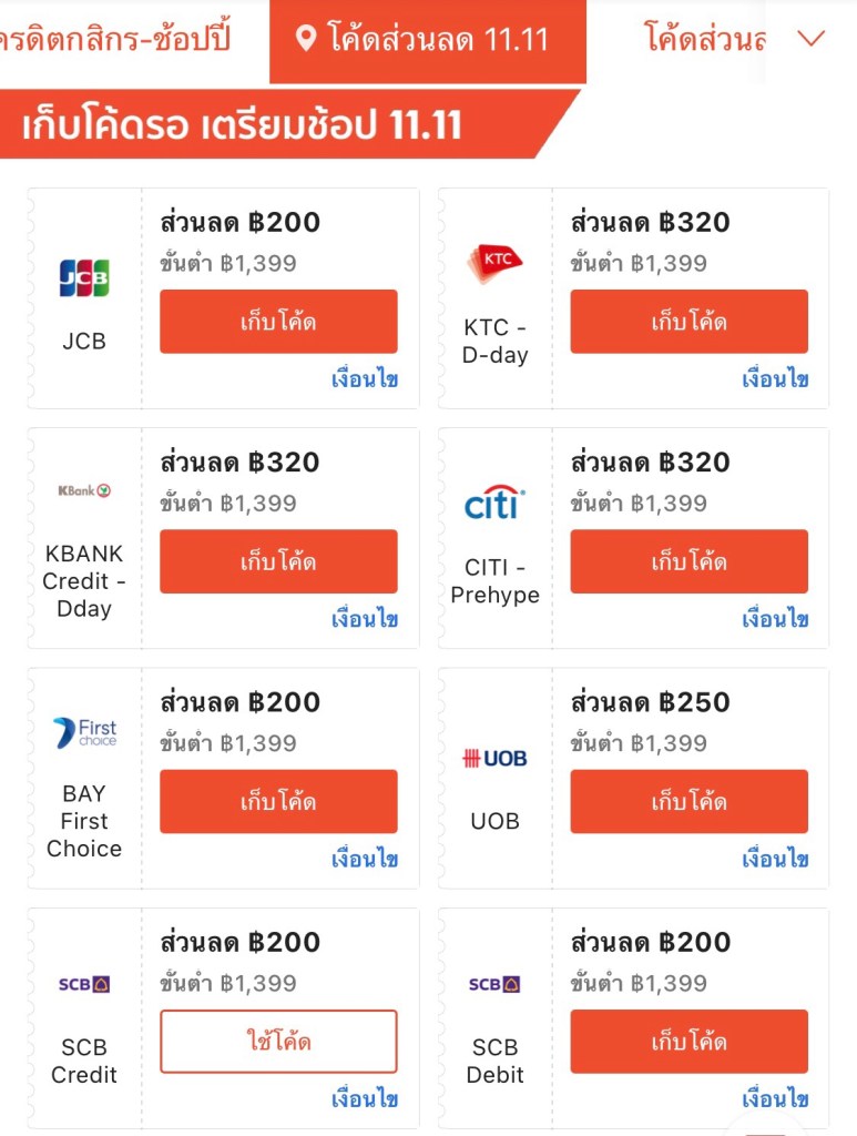 ไม่ต้องแปลกใจว่าบางบัตรเครดิตไม่ร่วมรายการ ในส่วนบัตรเครดิตที่ให้ส่วนลดกับ Shopee เราต้องซื้อขั้นต่ำให้ถึงยอดที่กำหนด ตอนนี้มีจำนวนขั้นต่ำเริ่มต้น 1,399 บาท ลดสูงสุด 320 บาท ด้วยบัตรเครดิต KTC, Kbank, Citibank ซึ่งโค้ดนี้มักจะหมดเร็วไม่เกิน 12.00 น. ของวันที่ 11 พฤศจิกายน (จากประสบการณ์ผู้เขียนที่เฝ้ามา 3 ปี)