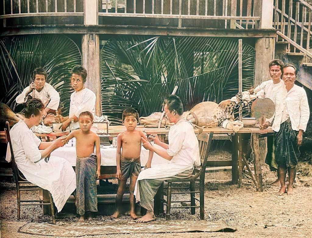 (ภาพถ่ายขาวดำ การปลูกฝีเมื่อ 120 ปีก่อน โดยหลวงอนุสาร สุนทรกิจ ชัวย่งเส่งสตูดิโอ เชียงใหม่ สำเนาภาพจากหนังสือภาพถ่ายฟิล์มกระจก เมืองเชียงใหม่ โดย หลวงอนุสารสุนทรกิจ)