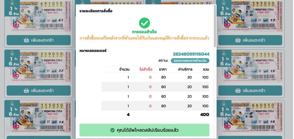 หลังจากชำระเงินก็ Upload สลิปขึ้นไปในหน้าเว็บก็จะขึ้นเครื่องหมายจองสำเร็จเป็นสีเขียว ตัวสลากจะเขียนราคา 80 บาท ตามกฎการขายทุกอย่าง แต่จะมีค่าบริการใบละ 20 บาท