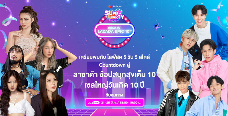 เตรียมพบการเฉลิมฉลองสุดยิ่งใหญ่ที่ไม่เคยเกิดขึ้นที่ไหนมาก่อน ครั้งแรกกับ Lazada EPIC 10th Birthday Super Party ฉลองวันเกิด 10 ปีลาซาด้า ที่ยกกองทัพศิลปินดาราชื่อดังมากมาย มาพร้อมกับโชว์พิเศษสุดปังสำหรับงานนี้เท่านั้น อาทิ ลาซาด้าแบรนด์แอมบาสเดอร์ อย่าง เบลล่า-ราณี, ใบเฟิร์น-พิมพ์ชนก, มาริโอ้ เมาเร่อ, บิวกิ้น-พุฒิพงศ์, พีพี-กฤษฏ์, ไบร์ท-วชิรวิชญ์, วิน-เมธวิน, และหนุ่มๆ ผู้ชนะ จากรายการ LAZ iCON อีกทั้งนักร้องตัวท็อปที่มาร่วมสร้างสีสันอย่าง แสตมป์ อภิวัชร์, อิ้งค์ วรันธร และ URBOYTJ รวมไปถึงศิลปิน T-POP รุ่นใหม่มากความสามารถที่ต่อแถวพร้อมมอบความบันเทิงและโชว์ความมันส์แบบจัดเต็มไม่ว่าจะเป็น 4EVE, TRINITY, ATLAS, PiXXiE, bamm, Proo Thunwa, 4MIX และหนุ่มๆ Finalist จากรายการ LAZ iCON ความพิเศษยังไม่หมดเพียงเท่านี้ นอกจากความบังเทิงที่จะได้รับแบบจัดเต็มแล้ว นักช้อปเตรียมพบกับการกลับมาอีกครั้งของการแจกของรางวัลครั้งใหญ่ 10 รางวัล ตลอดทุกชั่วโมง พร้อมทั้ง Voucher Rain มาให้ได้เก็บกันอย่างจุใจ เพื่อใช้เป็นส่วนลดร่วมกับคูปองส่งฟรี และ Lazada Bonus ตลอดช่วงเวลาแคมเปญ รวมมูลค่ากว่า 3,000,000 บาท