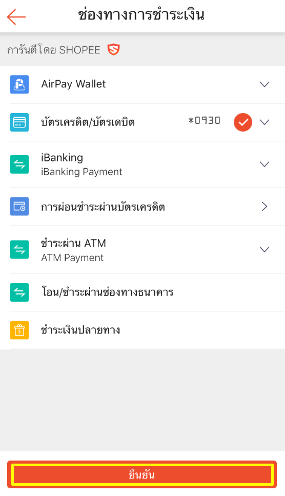 หลังจากนั้นก็เลือกช่องทางการชำระเงิน หากเป็นบัตรเครดิต ก็สามารถใช้โค้ดส่วนลด Partner ที่เก็บไว้มาลดอัตโนมัติได้เช่นกัน (เก็บโค้ดส่วนลดบัตรเครดิต Shopee ได้ที่นี่)