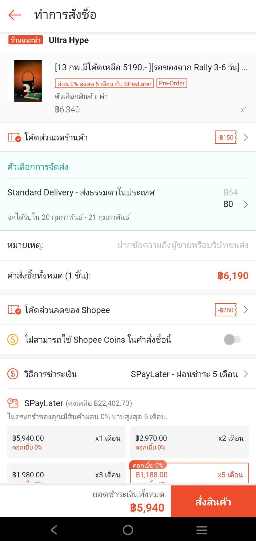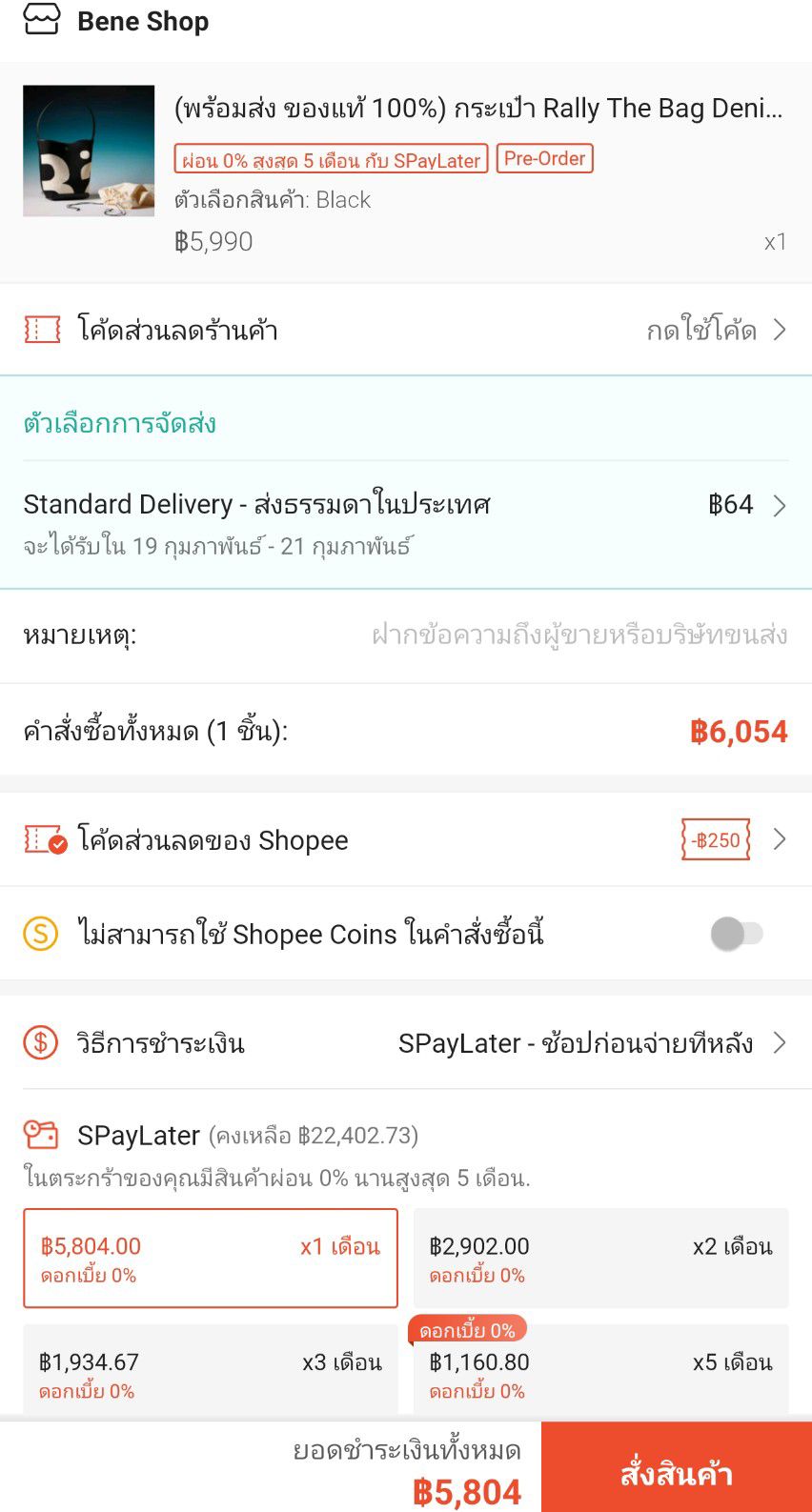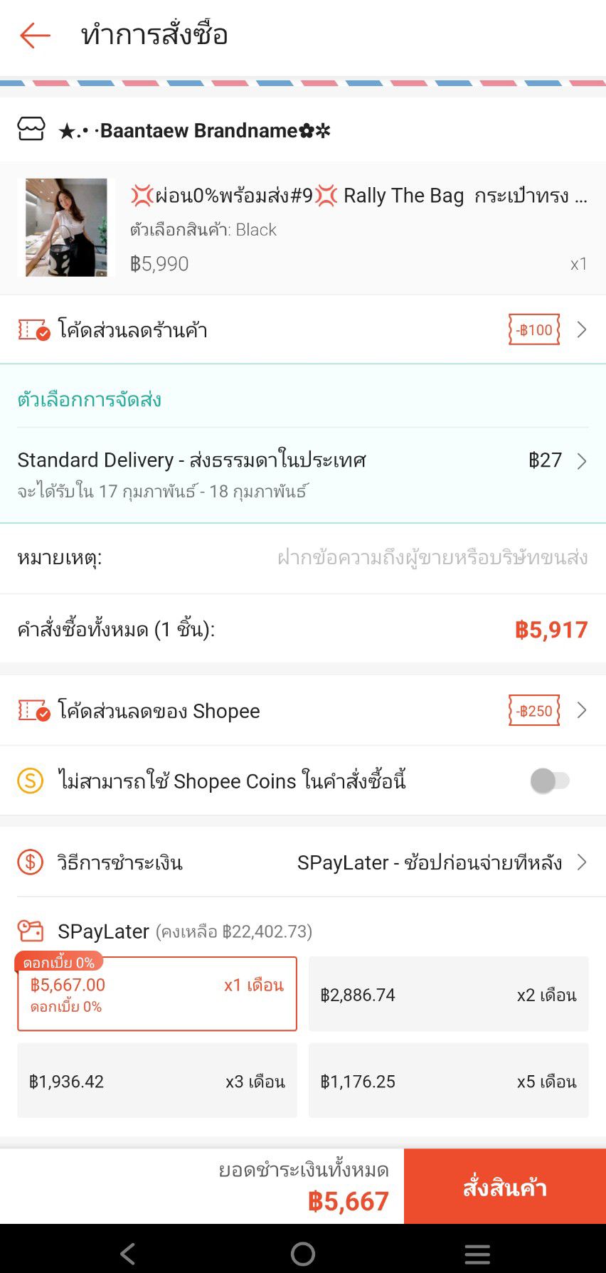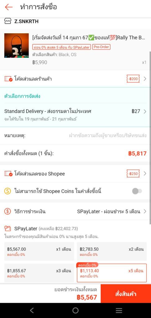 1. ร้าน Baantaew Brandname จำหน่ายกระเป๋า Rally ในราคา 5,XXX บาท ลูกค้าสามารถใช้ส่วนลดกับทางแอปฯ และผ่อน SPayLater ได้ 0% ในเดือนแรก ผ่อนได้สูงสุด 5 เดือน แต่มีดอกเบี้ย