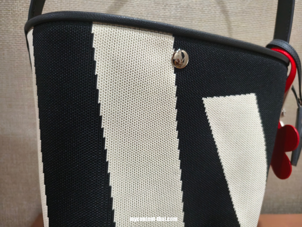 กระเป๋าทรงถังทอลายโลโก้ด้วยเทคนิค Sturdy Stretch Knit มีน้ำหนักเบา แข็งแรงทนทาน เช็ดทำความสะอาดได้ง่าย หูกระเป๋าและอะไหล่ส่วนต่างๆ ทำจากหนังวีแกน ตกแต่งด้วยกระดุมลายโลโก้ RM เหมาะสำหรับใช้งานได้หลายโอกาสในทุกๆ วัน