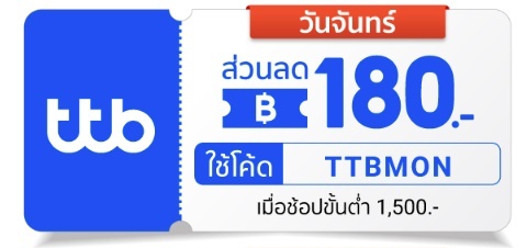 ผู้ที่ถือบัตรเครดิต TTB ใช้เป็นส่วนลด 180 บาท กับ Shopee ได้ในทุกวันจันทร์ เพียงกรอกโค้ด “TTBMON” สำหรับการสั่งซื้อขั้นต่ำ 1,500 บาท