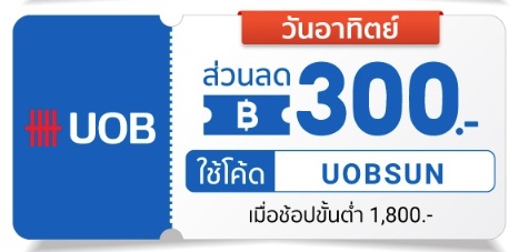 ผู้ที่ถือบัตรเครดิต UOB ใช้เป็นส่วนลด 300 บาท กับ Shopee ได้ในทุกวันอาทิตย์ เพียงกรอกโค้ด “UOBSUN” สำหรับการสั่งซื้อขั้นต่ำ 1,800 บาท