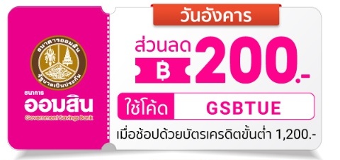 ผู้ที่ถือบัตรเครดิต GSB ใช้เป็นส่วนลด 200 บาท กับ Shopee ได้ในทุกวันอังคาร เพียงกรอกโค้ด “GSBTUE” สำหรับการสั่งซื้อขั้นต่ำ 1,200 บาท