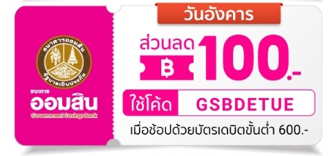 ผู้ที่ถือบัตรเดบิต GSB ใช้เป็นส่วนลด 100 บาท กับ Shopee ได้ในทุกวันอังคาร เพียงกรอกโค้ด “GSBDETUE” สำหรับการสั่งซื้อขั้นต่ำ 600 บาท