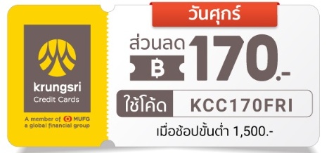 ผู้ที่ถือบัตรเครดิต KrungSri ใช้เป็นส่วนลด 170 บาท กับ Shopee ได้ในทุกวันศุกร์ เพียงกรอกโค้ด “KCC170FRI” สำหรับการสั่งซื้อขั้นต่ำ 1,500 บาท