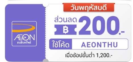 ผู้ที่ถือบัตรเครดิต AEON ใช้เป็นส่วนลด 200 บาท กับ Shopee ได้ในทุกวันพฤหัสบดี เพียงกรอกโค้ด “AEONTHU” สำหรับการสั่งซื้อขั้นต่ำ 1,200 บาท