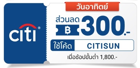 ผู้ที่ถือบัตรเครดิตซิตี้ ใช้เป็นส่วนลด 300 บาท กับ Shopee ได้ในทุกวันอาทิตย์ เพียงกรอกโค้ด “CITISUN” สำหรับการสั่งซื้อขั้นต่ำ 1,800 บาท