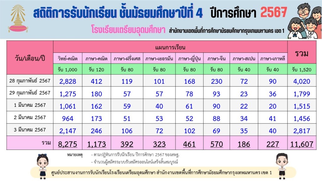 ในปี พ.ศ. 2567 นี้ เมื่อพิจารณาแล้ว มีผู้สมัครสอบทั้งหมด 11,607 คน รับเพียง 1,520 คน เท่าน้ัน โดยแบ่งเป็นห้องต่างๆ ดังนี้