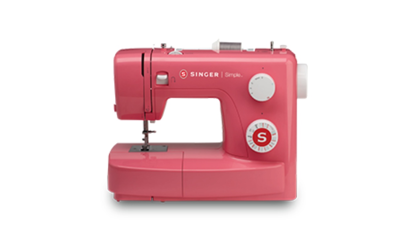 จักรเย็บผ้ากระเป๋าหิ้วซิงเกอร์ รุ่น Simple 3223R หัวจักรสีชมพู เย็บได้ทั้งหมด 23 ลาย และเย็บรังดุมอัตโนมัติได้ในเครื่องเดียว ฐานจักรถอดออกเพื่อเย็บกางเกงขากระบอกได้ น้ำหนักเบา พกพาสะดวก