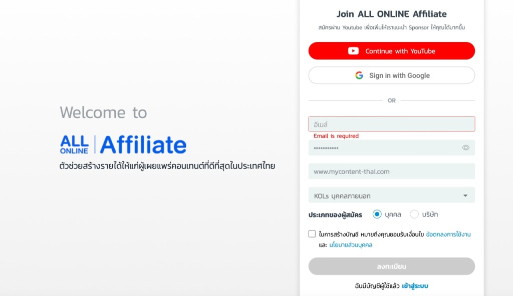 เลือก อีเมล และ พาสเวิร์ด สำหรับเข้าร่วม All Online Affiliate เพื่อใช้ Log In ในครั้งต่อไป