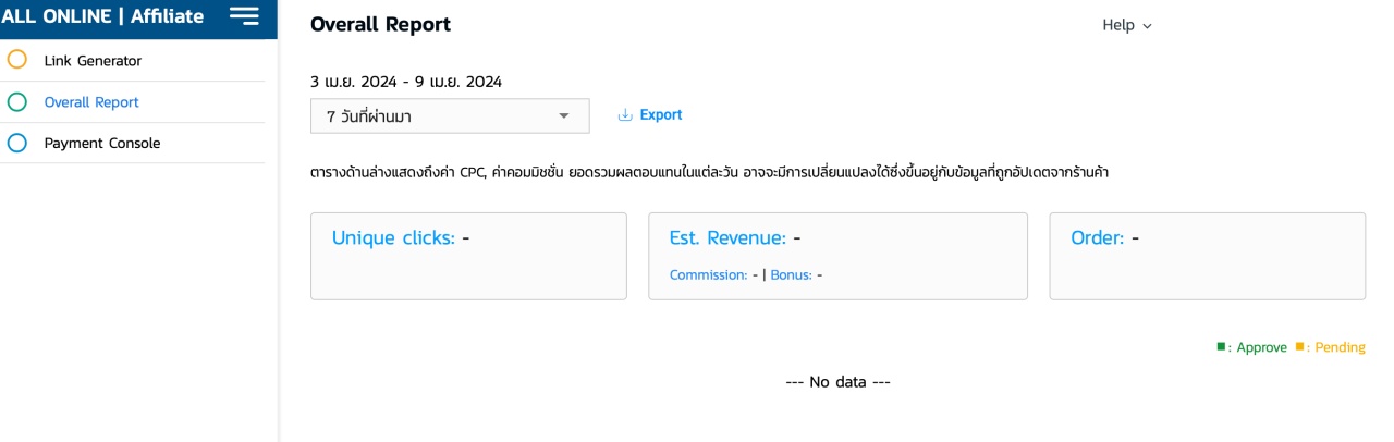 เมื่อล็อกอินเข้าสู่หน้าแดชบอร์ดของ 7-11 All Online Affiliate แล้ว ตรวจสอบเมนูต่างๆ ได้แก่