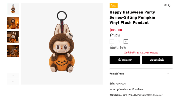 ชุดลาบูบู้ฮาโลวีน ราคา 749 บาท คลิกสั่งซื้อได้ที่นี่ เห็นราคาแรงๆ แบบนี้ คือราคาของชุดลาบูบู้ตัวใหญ่ ขนาด 38 เซนติเมตร ถ้าใครกำลังตามหาชุดฟักทองให้น้องบู้ตัวใหญ่ที่สะสมไว้อยู่ เพื่อเฉลิมฉลองเทศกาล Halloween ในการ Decorate บ้าน ร้านอาหาร ก็ลองเข้าไปดูสินค้าในร้านนี้