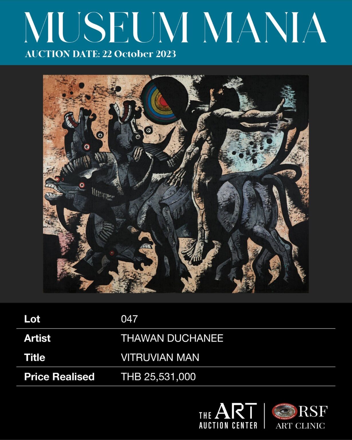 อีกหนึ่งผลงานที่เพิ่งถูกนำออกมาประมูลในงานศิลปะ ‘Museum Mania’ ริเวอร์ซิตี้ แบงค็อก เมื่อปี พ.ศ. 2564 คือภาพที่มีชื่อว่า ‘วิทรูเวียนแมน’ (Vitruvian Man) ถูกประมูลไปด้วยราคา 25.5 ล้านบาท