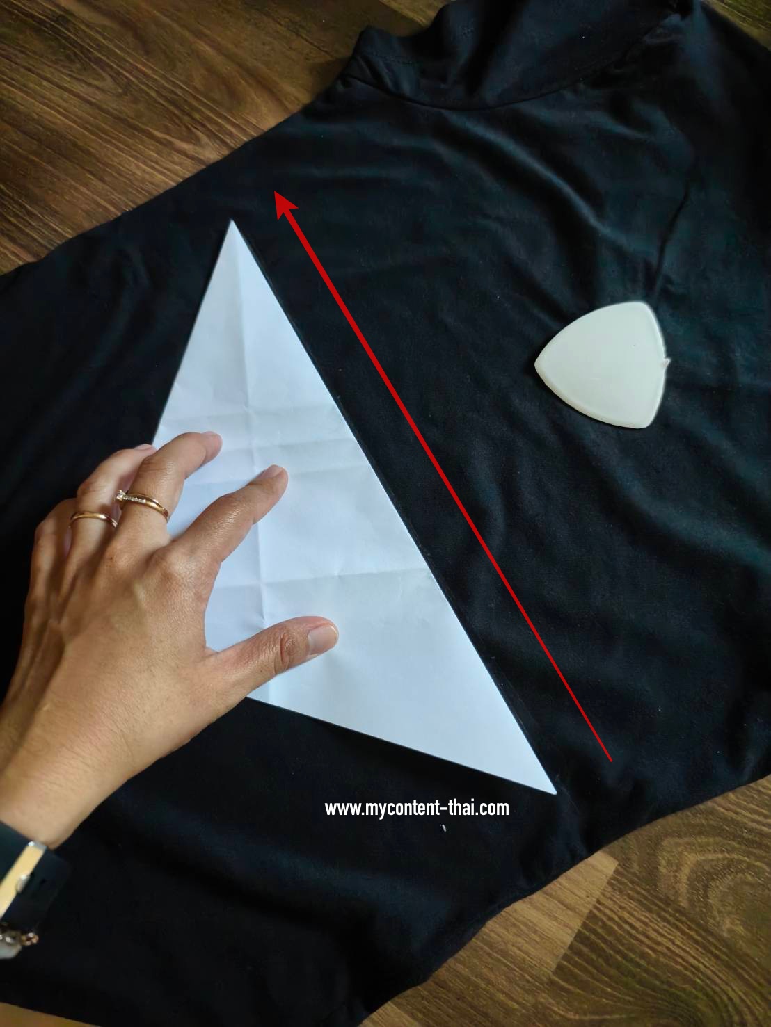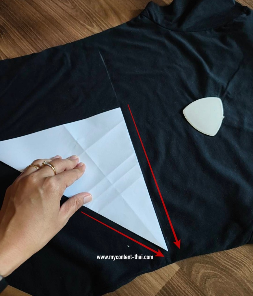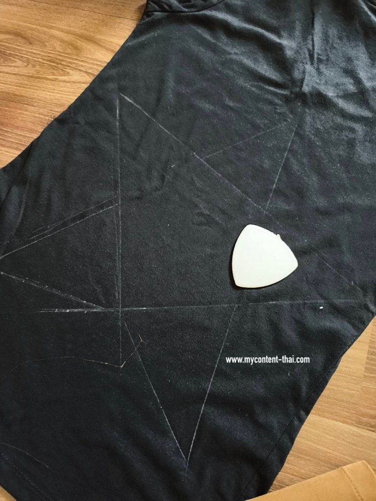 ใช้ฐานของรูปสามเหลี่ยมหน้าจั่วที่ตัดไว้ทาบบนเสื้อยืดสีดำ ใช้ชอล์กเขียนผ้าตีเส้น โดยตีเส้นให้ยาวพอดีปิดหน้าอกของผู้สวมใส่