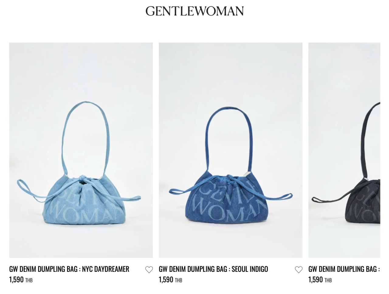กระเป๋าเกี๊ยว Gentlewoman Dumpling สียีน 3 สี วางจำหน่ายที่เว็บไซต์ http://www.gentlewomanonline.com และหน้าร้าน จำกัด 1 คน 1 บิล เปิดตัวด้วยราคา 1,590 บาท เพิ่มจากรุ่นเดิมมา 300 บาท โดยมีแต่ละชื่อสีดังนี้
