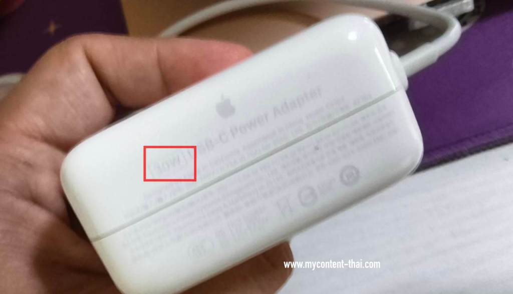 มองหาข้อความที่เขียนเกี่ยวกับกำลังไฟ บนหัวชาร์จ MacBook โดยบางรุ่นถ้าไม่สังเกตดีๆ ก็แทบจะมองไม่เห็น ตัวอย่างหัวชาร์จ Macbook Air M1 รุ่นนี้ใช้กำลังไฟ 30W