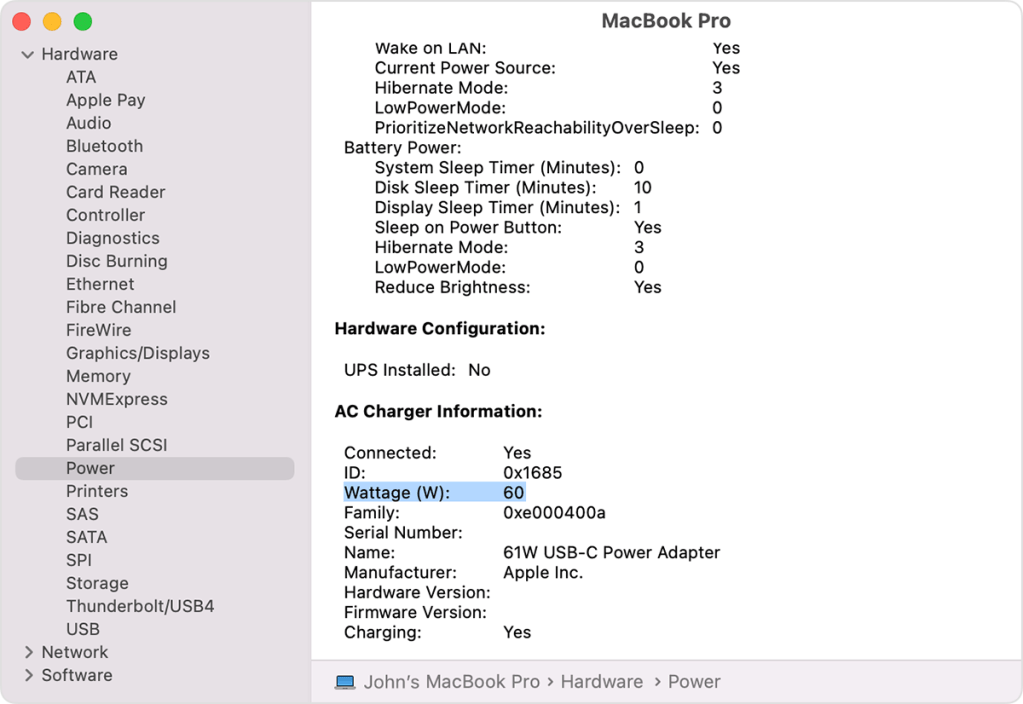 กดปุ่ม Option ค้างไว้ และเลือกเมนู Apple > ข้อมูลระบบ จากนั้นเลือก กำลังไฟ ค้นหากำลังวัตต์ในส่วนอุปกรณ์ชาร์จ AC ที่บริเวณด้านล่าง ตัวอย่างนี้เป็น MacBook Pro ที่ใช้กำลังไฟ 60w