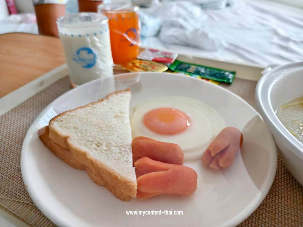 - มื้อเช้า Breakfast ไข่ดาว ไส้กรอก ขนมปัง 2 แบบ มีแยมและเนยให้เลือก + โจ๊กหรือข้าวต้ม