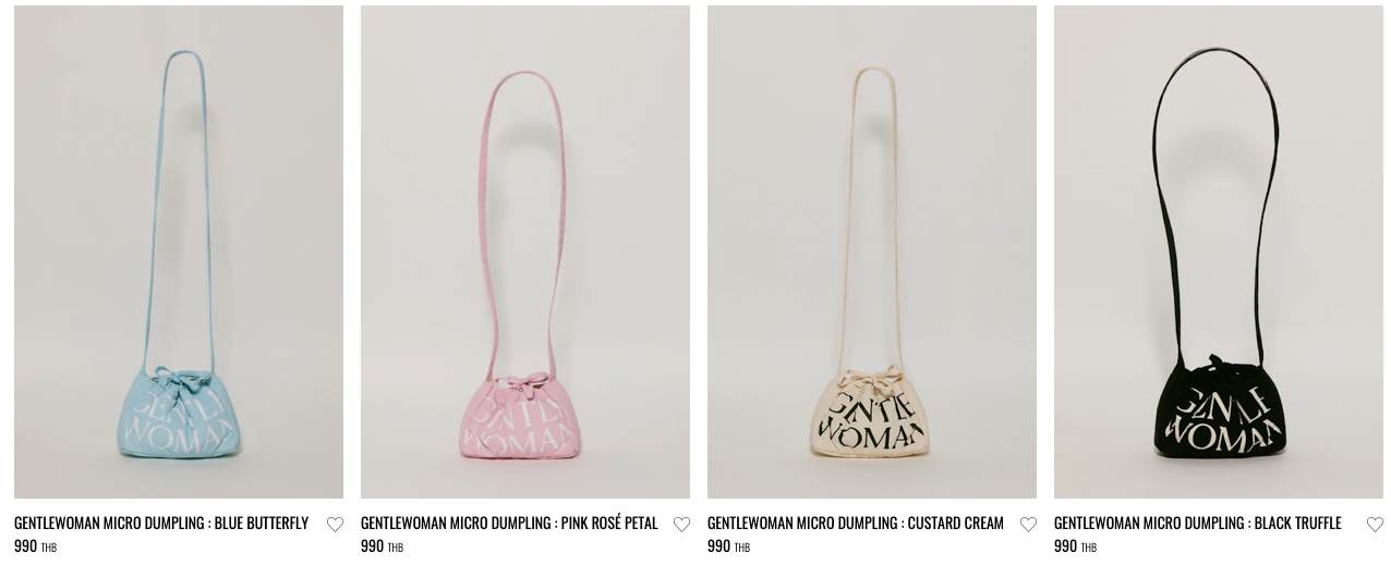 กระเป๋าเกี๊ยว GENTLEWOMAN เป็นสินค้ายอดฮิตในปี 2567/2024 จากรุ่น GENTLEWOMAN DUMPLING ราคา 1,290 บาท ใช้วัสดุที่กันน้ำ เปิดตัวได้เข้ากับฤดูกาลหน้าฝน ได้รับเสียงตอบรับที่ดีจนทางแบรนด์กำลังจะวางขายกระเป๋าเกี๊ยว GENTLEWOMAN รุ่นใหม่ ไซส์ MICRO ในราคา 990 บาท