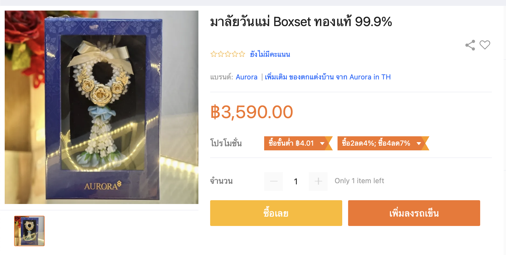 พวงมาลัยวันแม่บ็อกซ์เซ็ต ทอง 99.99% อยู่ในกล่องสีน้ำเงินสวยงาม พวงมาลัยงานดินเบาปั้นขึ้นรูปเป็นพวงมาลัย ขนาดเส้นผ่าศูนย์กลาง 9 cm. ความยาว รวม 18 cm. ประดับเพิ่มด้วยแผ่นทองงานหัตถศิลป์ ในกล่องสีน้ำเงินลายไทย ขนาด 16*25 cm. (คลิกสั่งซื้อได้ที่ Lazada)