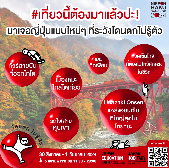 เจเอ็ดดูเคชั่น สถาบันสอนภาษาและศูนย์แนะแนวศึกษาต่อประเทศญี่ปุ่น เตรียมจัดงานมหกรรมเพื่อคนรักญี่ปุ่นแบบครบทุกเรื่องครั้งใหญ่ที่สุดในประเทศไทย กับงาน “NIPPON HAKU BANGKOK 2024” ที่ปีนี้จัดขึ้นเป็นปีที่ 9 กลับมาสร้างความสุขแบบครบทุกมิติ ไม่ว่าคุณจะเป็นด้อมวงการไหนของญี่ปุ่น คุณจะ #โดนตกไม่รู้ตัว อีกครั้ง เตรียมตัวมาฟินกับขบวนกิจกรรมสุดเอ็กซ์คลูซีฟมากมาย พร้อมความบันเทิงที่ยกทัพมาสร้างความสุขแบบจุกๆ ภายในงาน แฟนด้อมเจแปนเตรียมตัวให้พร้อม! งานจัดขึ้น ระหว่างวันที่ 30 สิงหาคม – 1 กันยายน 2567 ณ ชั้น 5 สยามพารากอน