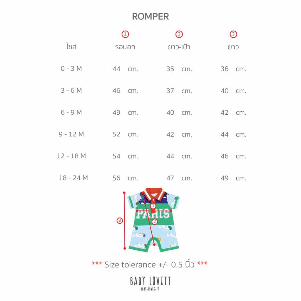 รอมเปอร์ (Romper) ของเบบี้โลเว็ต จะมี 2 แบบ คือ หุ้มเท้า และเปิดเท้า ใส่ได้ตั้งแต่แรกเกิด ถึง 3 ปี โดยมีตัวย่อของไซส์ เป็น 0-3M, 3-6M, 6-9M, 9-12M,12-18M, 18-24M และ 3T โดยแต่ละไซต์จะอิงตามความสูง อายุ น้ำหนัก รอบอก มากกว่าช่วงอายุ ดังนี้