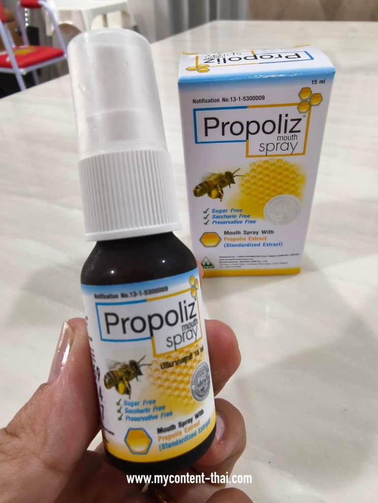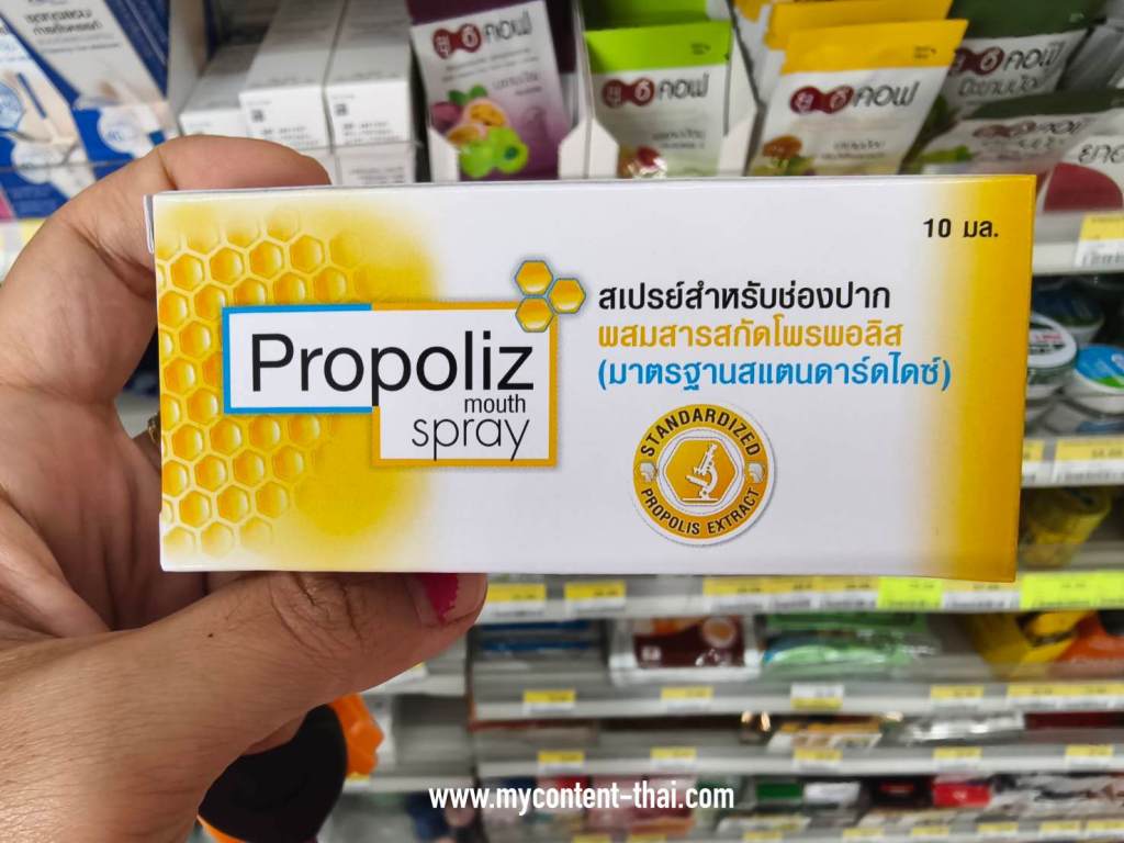 สเปรย์ Propolis แบบที่ขายในเซเว่น มีราคา 99 บาท ขนาด 10 ml. รสชาติจะซ่าๆ นิดหนึ่ง เด็กโตใช้ได้ ส่วนเด็กเล็กมีสูตรสำหรับเด็กเล็กโดยเฉพาะ วิธีใช้ฉีดพ่นได้ตามต้องการ มีส่วนผสมของน้ำผึ้ง และสารสกัดจากรังผึ้งที่ช่วยให้ชุ่มคอได้นาน