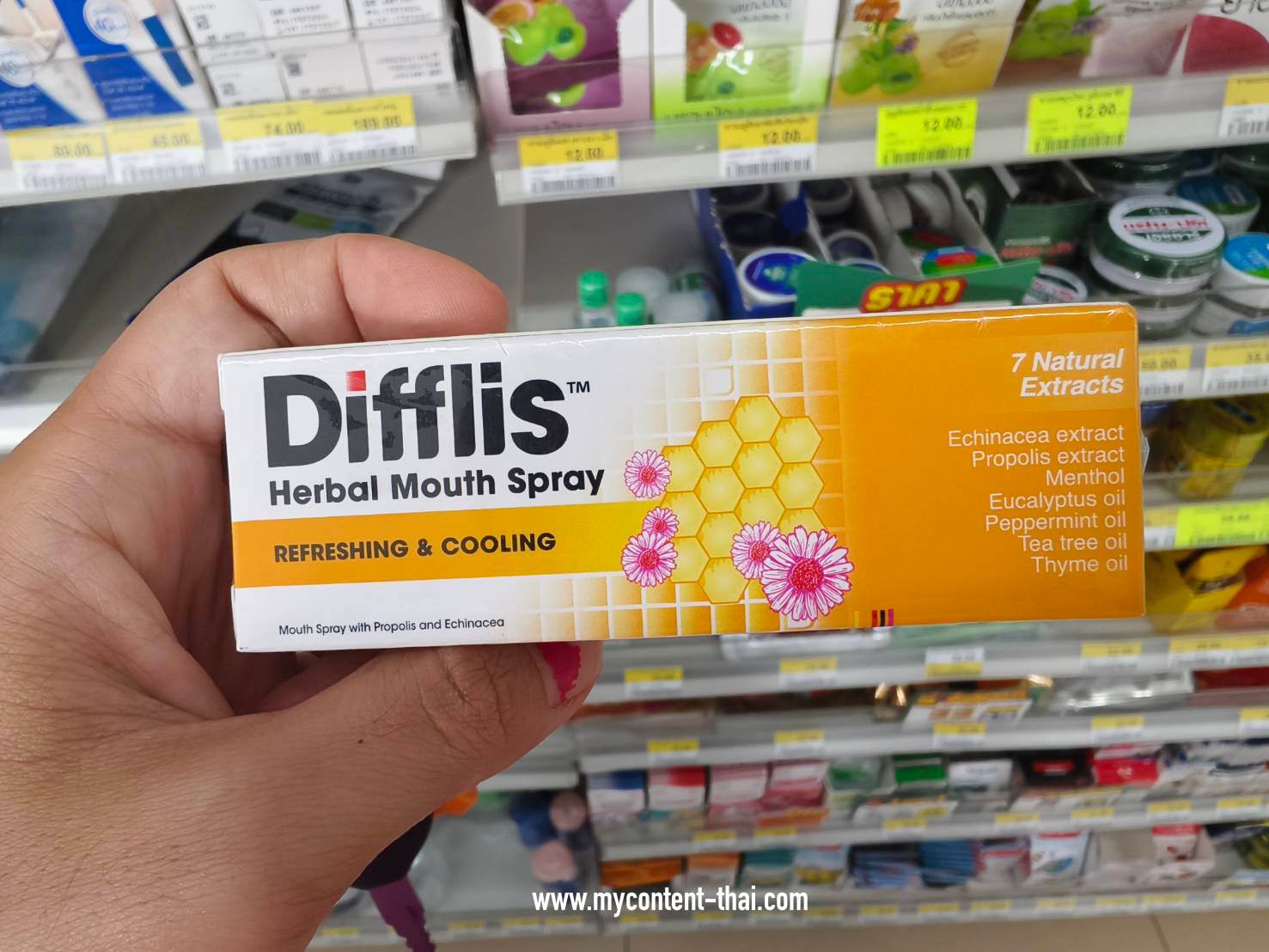 Difflis Herbal Mouth Spray Refreshing & Cooling Spray อีกหนึ่งผลิตภัณฑ์สเปรย์ช่วยบรรเทาอาการไอและเจ็บคอที่มีขายใน 7-11 ไม่มีน้ำตาล ไม่มีแอลกอฮอล์ ไม่ทำให้แสบคอเพิ่มขึ้น ใช้พ่นในปาก 2-3 ครั้ง ที่มีอาการ มีสารสกัด 7 ชนิดที่ช่วยให้ชุ่มคอ ได้แก่ อิชิเนเชีย (Echinacea extract), โพรโพลิส (Propolis extract), เมนทอล (Menthol), ทีทรีออยล์ (Tea tree oil), ไทม์ออยล์ (Thyme oil), เปปเปอร์มิ้นท์ออยล์ (Peppermint oil) และ ยูคาลิปตัสออยล์ (Eucalyptus oil)