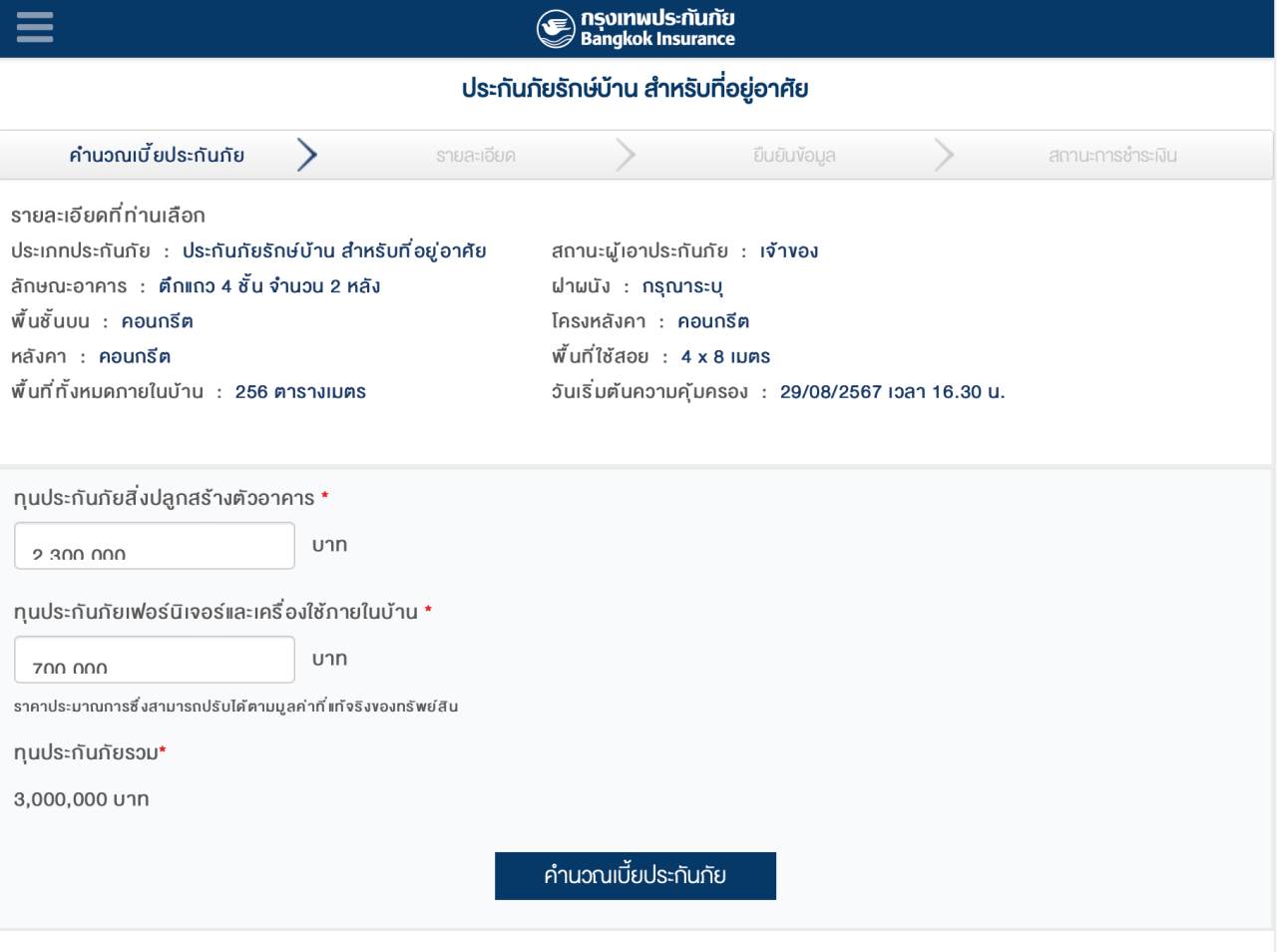 เมื่อเราคีย์ข้อมูลจากตัวอย่างข้างต้น เข้าไปที่เว็บไซต์บริษัทกรุงเทพประกันภัย จะพบว่า การประกันภัยของบริษัทจะคำนวณทุนประกันมาให้รวม 3,000,000 บาท แบ่งออกเป็น ทุนประกันสำหรับสิ่งปลูกสร้าง 2,300,000 บาท และทุนประกันเฟอร์นิเจอร์และเครื่องใช้ในบ้าน 700,000 บาท (เฉพาะภัยที่เกิดจากอัคคีภัย)