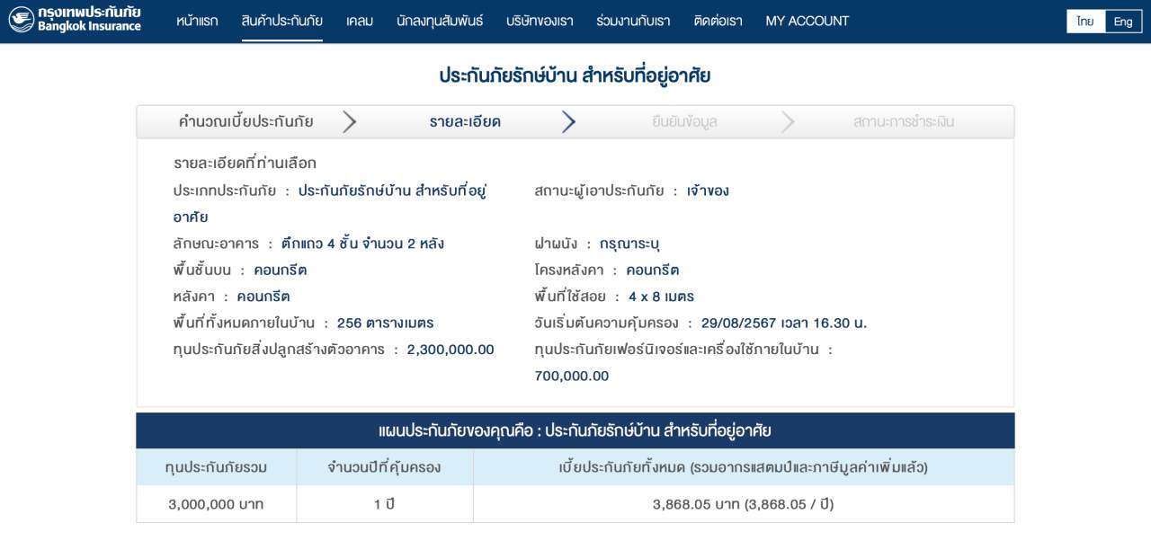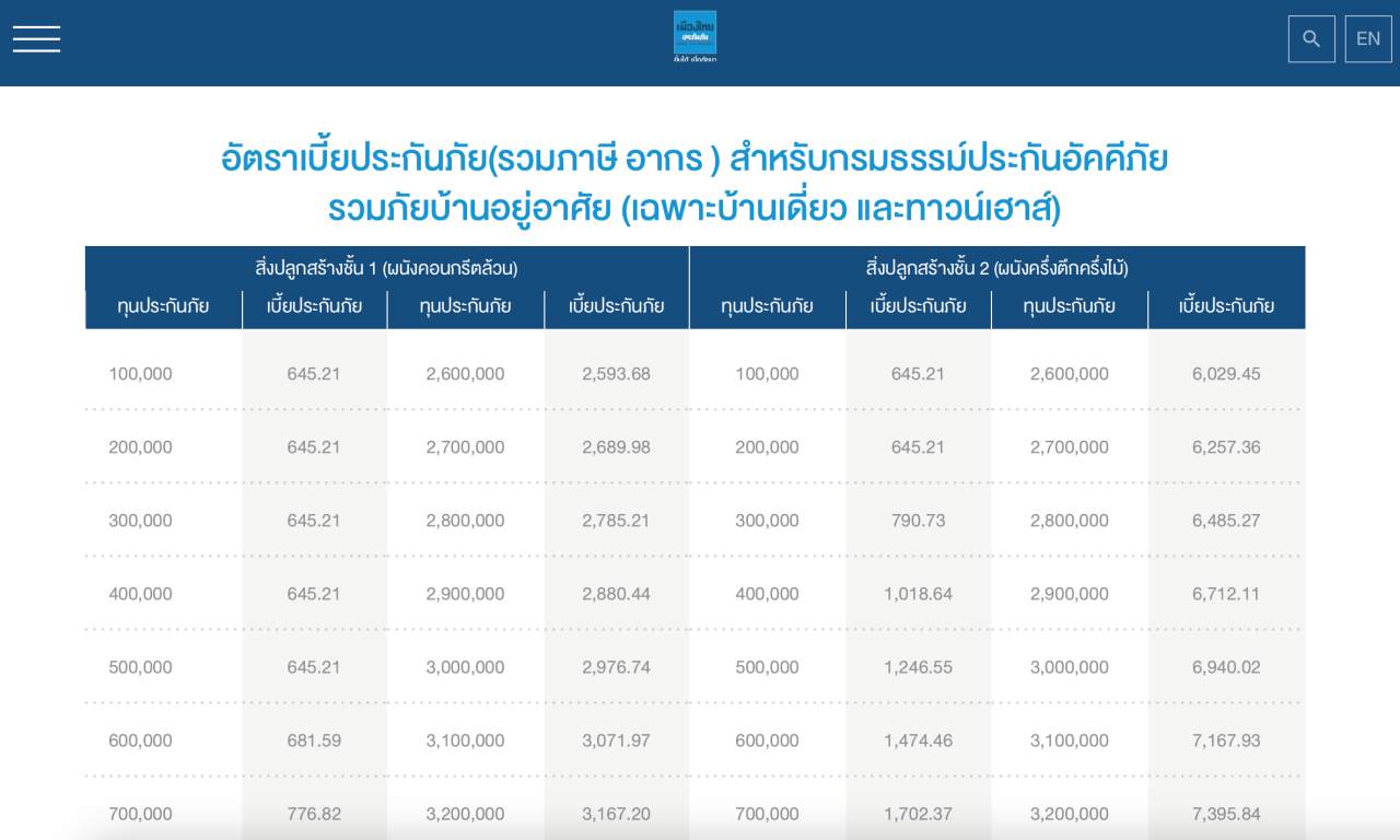 – เบี้ยประกันต่อปี 4,061 บาท คุ้มครองน้ำท่วมจ่ายเพิ่ม 880 บาท ทุนประกันทั้งหมด 3,000,000 บาท