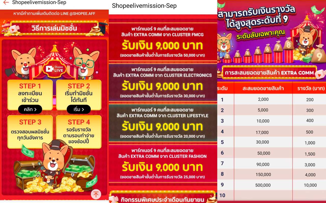 ผู้ที่สมัคร KOL กดสมัครเป็นนายหน้าขาย Shopee Affiliate เรียบร้อยแล้ว ภายในหน้า Dashboard จะมีแบนเนอร์กิจกรรมให้ร่วมสมัครเล่นมิชชั่น เริ่มต้นรับเงิน 200 บาท เมื่อไฟล์และมียอดขายตามที่กำหนด โดยจะได้ค่าคอมมิชชั่นเมื่อมีเพื่อนๆ สั่งซื้อสินค้าภายใน LIVE เท่านั้น ตัวอย่างกติกา และวิธีทำ Shopee Live มีดังนี้