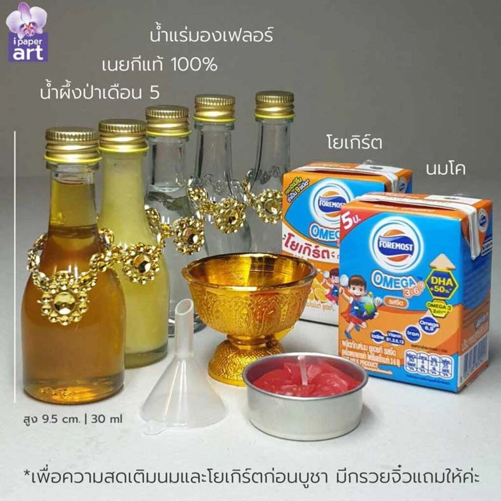 ตัวอย่างชุดของไหว้พระพิฆเนศ จากร้าน i paper art งานแฮนด์เมด ใน Shopee สินค้าของไหว้พระพิฆเนศในร้านนี้ประกอบด้วย ขวดแก้วทรงสูง 5 ใบ ที่ใส่ปัญจอมฤต ของเหลว 5 อย่าง ได้แก่ นม, น้ำดื่ม, เนย, โยเกิร์ต และน้ำผึ้งเดือน 5 ใช้ในพิธีบูชาสักการะองค์พระพิฆเนศ จัดหิ้งเทพฮินดูอื่นๆ ได้อีกด้วย