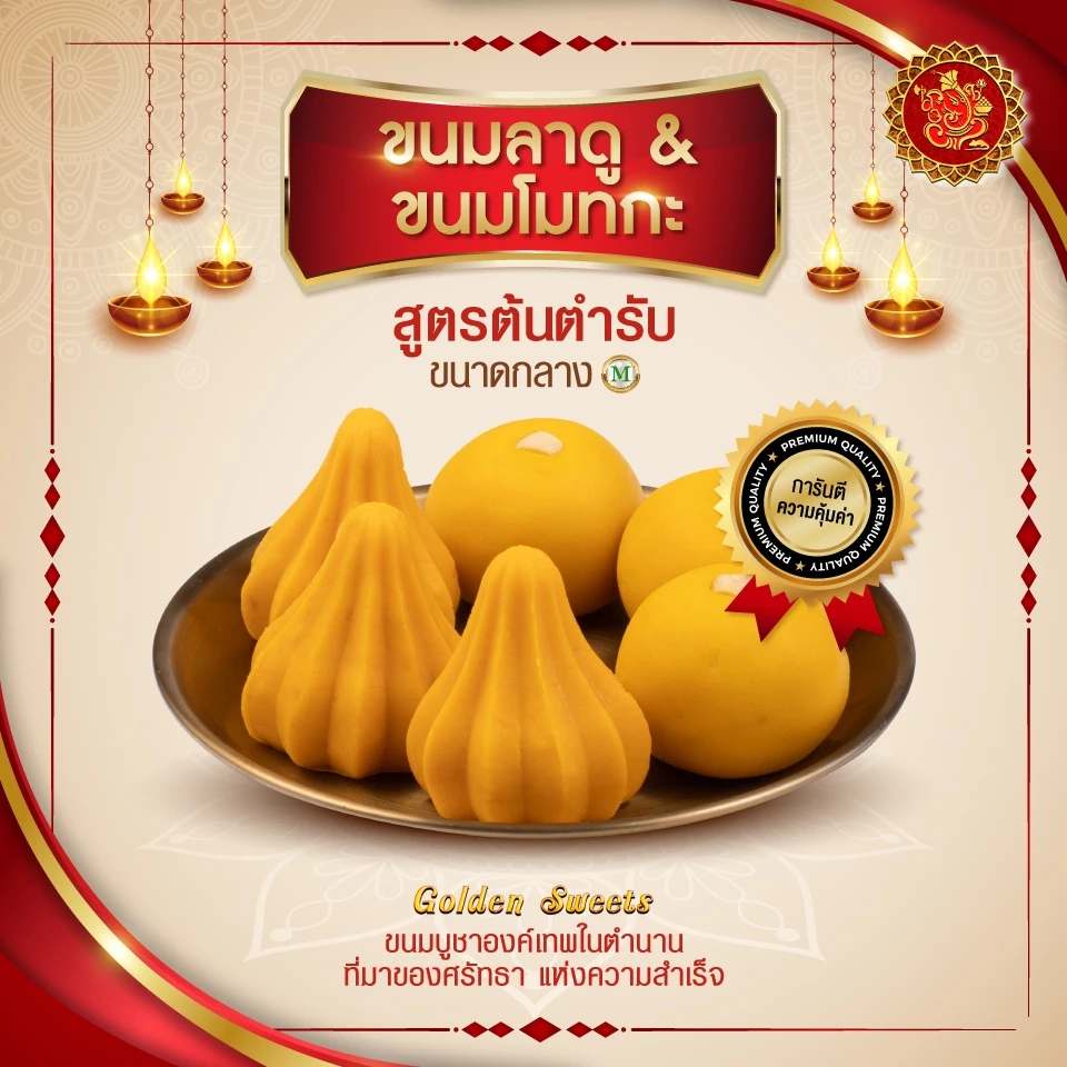 ผู้เริ่มต้นบูชาพระพิฆเนศควรรู้จักขนมลาดู-โมทกะ (ภาพจากร้าน Golden Sweets ขนมลาดู) มีหน้าตาเหมือนทองคำ สำหรับบูชาองค์พระพิฆเนศ และเทพฮินดูต่างๆ ทั้งขนมลาดู และขนมโมทกะ ขนมหวานนี้ทำมาจากแป้งห่อไส้นึ่งสุก โดยที่ไส้ทำมาจากมะพร้าวขูด ผสมเนย ผงกระวาน น้ำตาลทรายแดงและเกลือ ปั้นให้เป็นยอดแหลม การถวายขนมนี้ปรากฏในรูปปั้นพระพิฆเนศในยุคแรกๆ แสดงถึงความอุดมสมบูรณ์