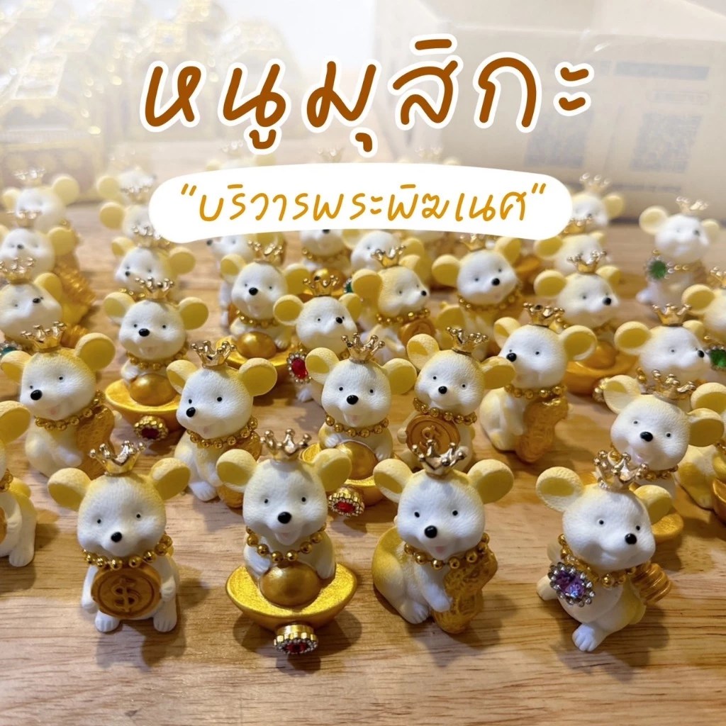 โมเดลหนูมุสิกะกับการถือของมงคล ความหมายดี อีกหนึ่งดีไซน์ของถวายพระพิฆเนศจากร้าน นะโม อินเตอร์เทรด ตัวละ 22 บาท เหมาะสำหรับการตั้งโต๊ะเทพ จัดวางองค์พระพิฆเนศบนโต๊ะทำงาน และหิ้งพระพิฆเนศเล็กๆ ในร้านค้า ออฟฟิศ ให้โดดเด่น สวยงาม