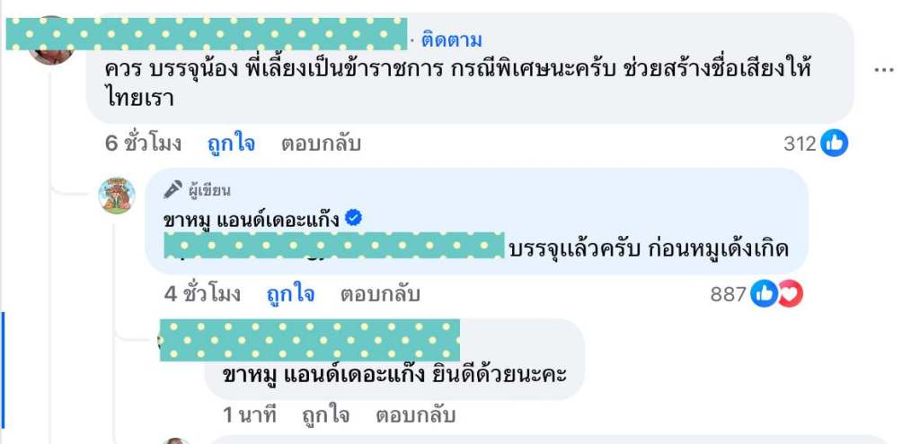 มีแฟนๆ หมูเด้งเป็นห่วงสวัสดิการ และผลประโยชน์ที่แอดมินหมูเด้งสมควรจะได้รับ อาทิ “บรรจุพี่เลี้ยงเป็นข้าราชการหรือยัง?” แฟนๆ ก็รู้สึกดีที่พี่เลี้ยงและผู้ดูแลสัตว์ต่างๆ ในสวนสัตว์เขาเขียว ได้รับการดูแลจากต้นสังกัดอย่างสมควรแล้ว.