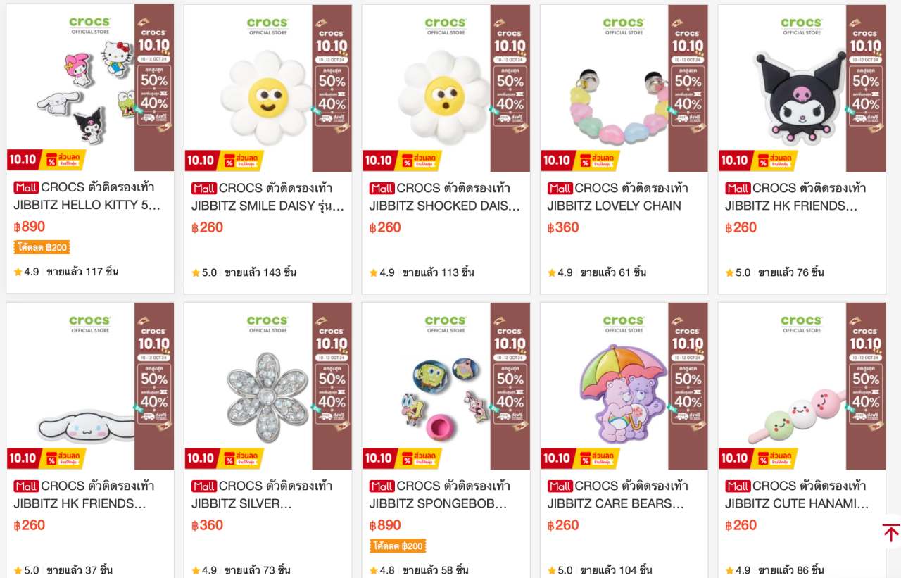 จิ๊บบิทสำเพ็ง : งานตัวติดรองเท้าจีนก็ไม่ได้แย่นะคะ มีให้เลือกเยอะมากๆ ใน Shopee หรือ Lazada ถ้าไม่รีบใช้ก็รอหน่อย 7-10 วันถึงไทย ไม่ว่าจะเป็น Sanrio Hello Kitty ที่ขายดีแบบของ Crocs ก็มีตัวติดรองเท้างานจีนเป็นทางเลือก ส่วนตอนนี้ที่ผู้เขียนเล็งไว้อยู่ก็คือเซ็ตที่มีผู้นำ POP BEAN มาประดิษฐ์เป็นจิ๊บบิท