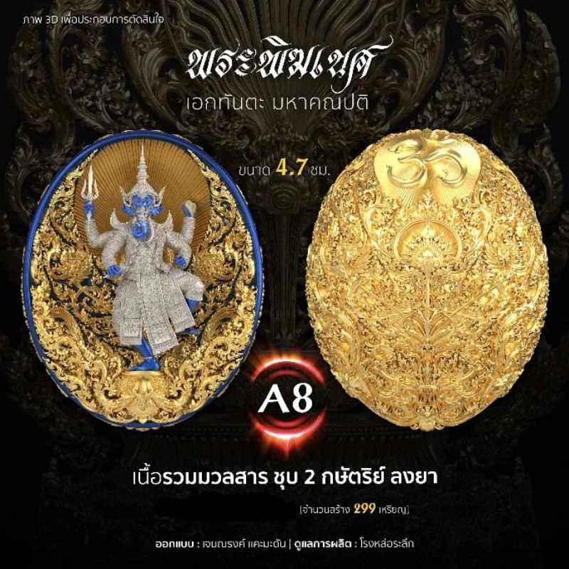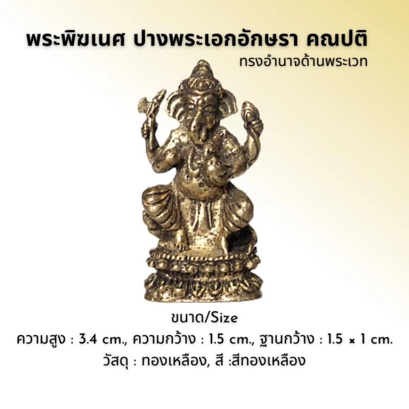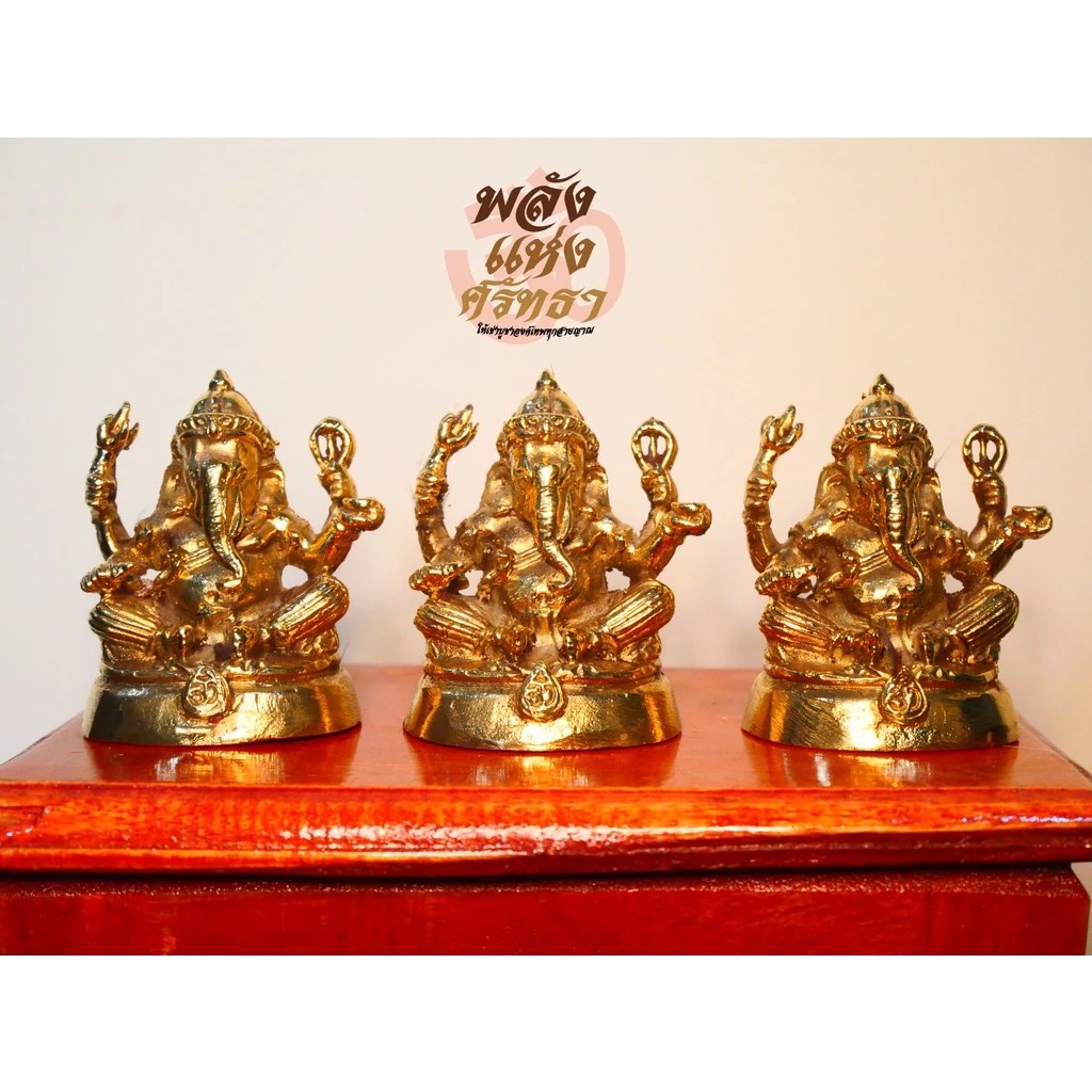 พระพิฆเนศปางพระสิทธิ คณปติ องค์พระพิฆเนศเป็นสีทอง พระกรทั้ง 4 ถือ ดอกไม้มะม่วง ต้นอ้อย ขวาน และขนม ผู้บูชาหวังพรด้านทรัพย์สิน เงินทอง สมบูรณ์เรื่องทรัพย์ เงินทองไหลมาเทมา