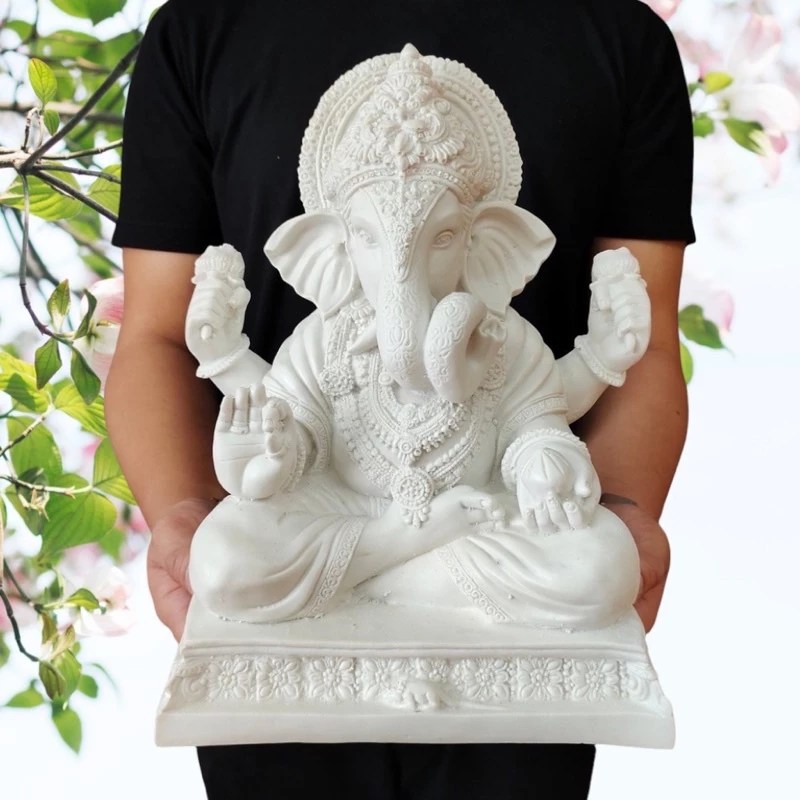 พระพิฆเนศปางเศรษฐีดั๊กดูเศรษฐ์ งานแบบอินเดีย หน้าตัก 9 นิ้ว สูง 30 ซม. มีทั้งแบบสีขาวดิบ และทาสีองค์งดงาม ราคาเช่าบูชา 590 – 790 บาท (คลิกเช่าบูชาที่นี่)